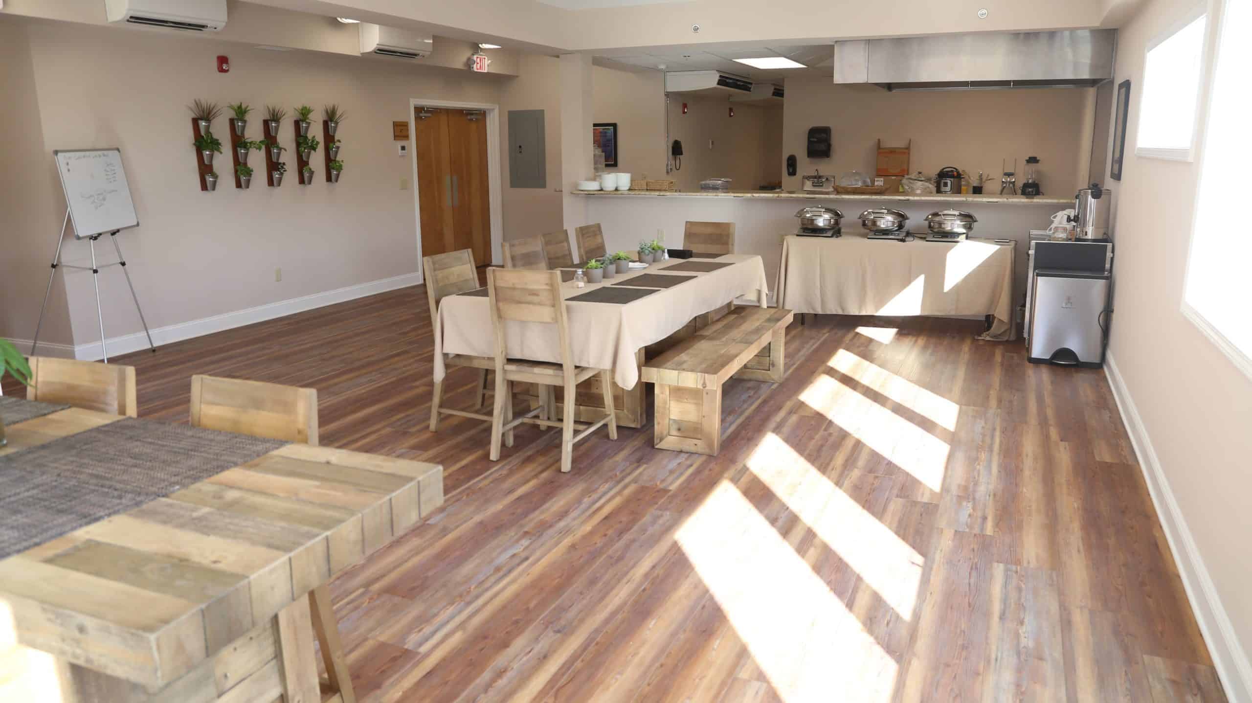 Ideal for large groups and events, the main hall features stunning natural light and a spacious grand room. A granite stone foyer leads to a natural wood interior and striking multi-tiered skylight that gives the venue a surprising coziness. The event space also has a performance stage with professional lighting and an advanced audio-visual system.