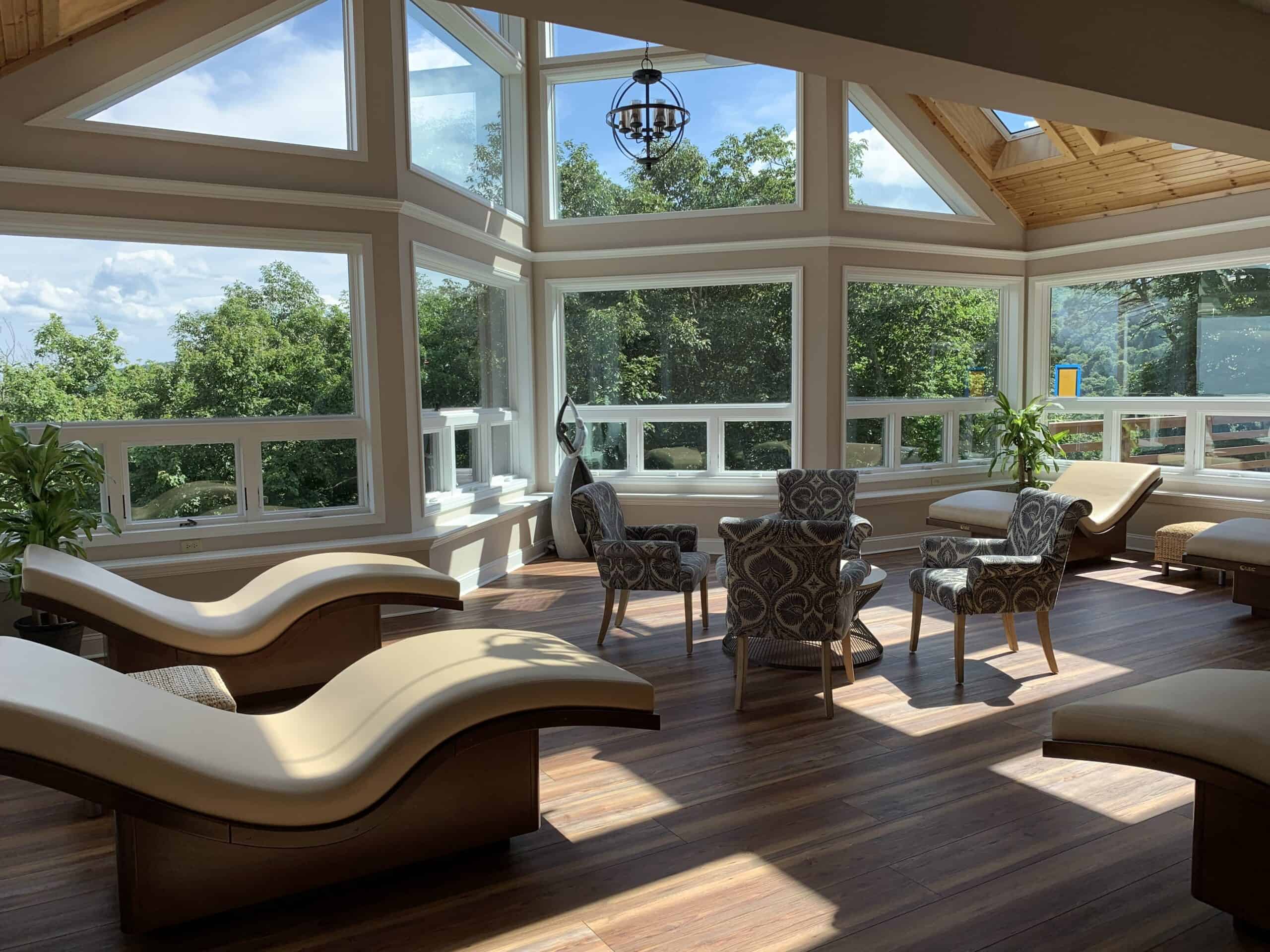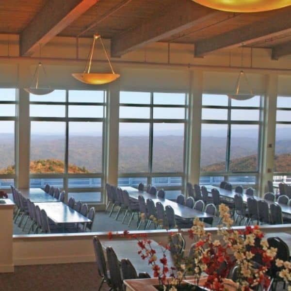 Each of these four special venues features spacious, open floor plans, plenty of natural light, and freely flowing air through the tall windows surrounding each hall. These hilltop event spaces are situated next to each other near the mountain top, making them ideal for groups requiring adjacent retreat spaces and/or break-out rooms. Three halls are carpeted, while one has hardwood flooring, which works well for yoga and performance groups.